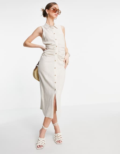 Asos Design Sleeveless Midi Shirt Dress With Ruching In Stone Asos